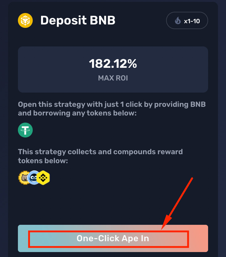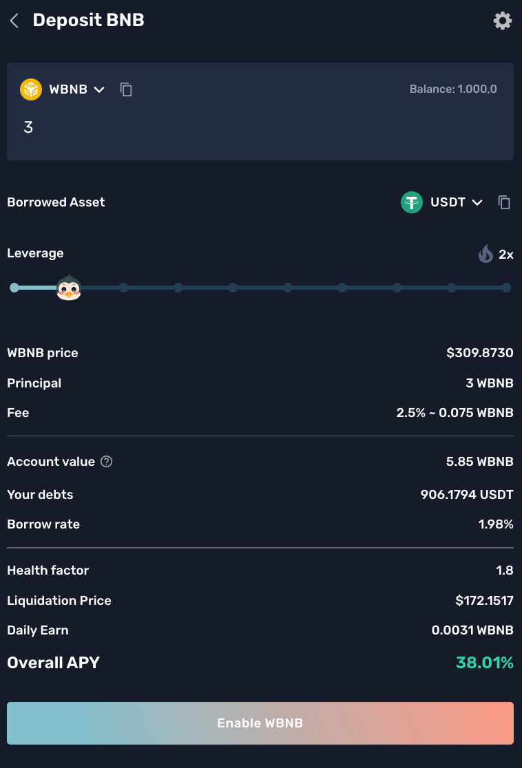 - Enter the number of WBNB you want to deposit and the leverage (from 1-10) you want to borrow.
