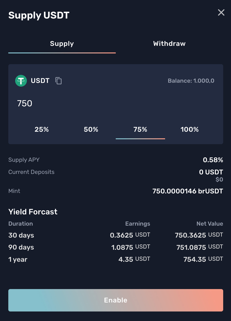 - At the “Passive Pools" click on “USDT pool" and a window will open. Choose the number of USDT that you want to supply and you will see all the details: