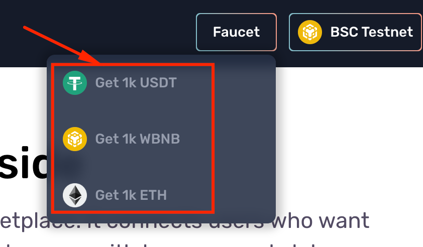 Step 2: Click on 3 tokens: USDT, WBNB, ETH to get test tokens.